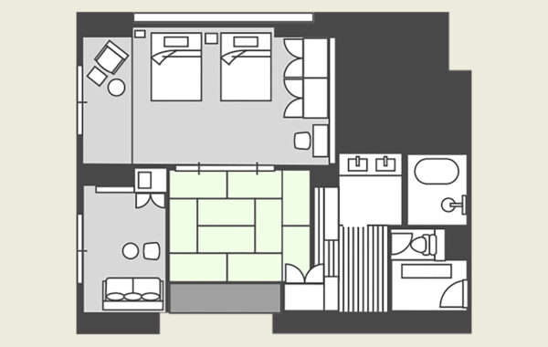 Other Beds with Simmons Beautyrest mattresses / Comforton futon / Takimotokan original folded pillow / Takimotokan original feather comforter / Yukata / Yukata overcoat / Sandals / Slippers / Hair dryer / Deodorizer / Electric kettle / Mineral water / Green tea / Green tea cups / Glasses / Bottle opener / Shoehorn / Dolce Gusto coffee machine / Mugs / Alarm