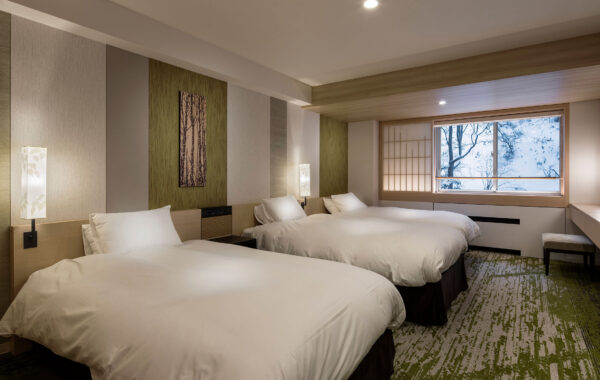 The rooms blend a modern Japanese sensibility in the relaxing colour palette, carpeting and furnishings.