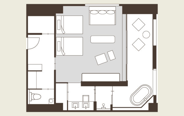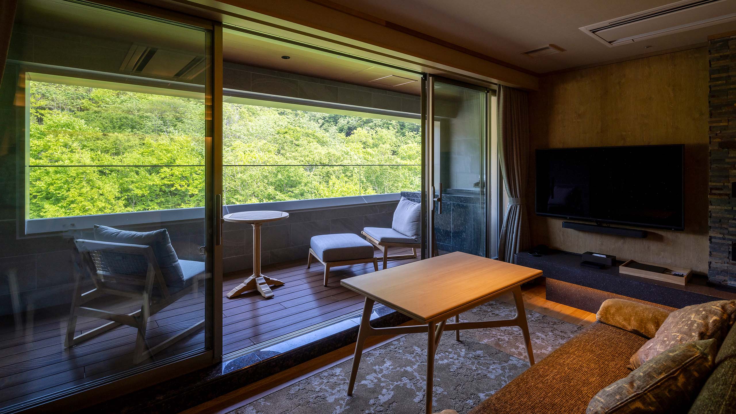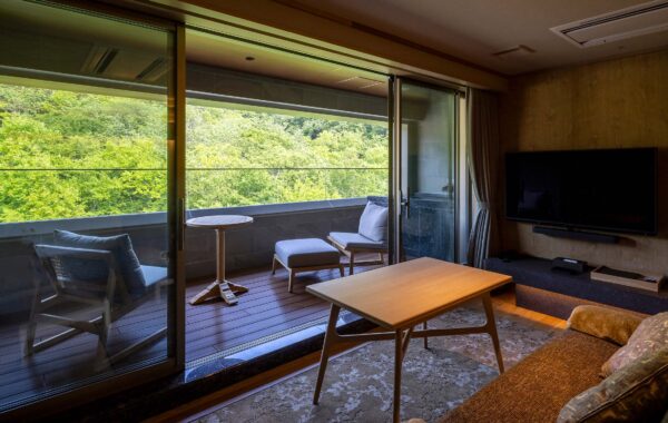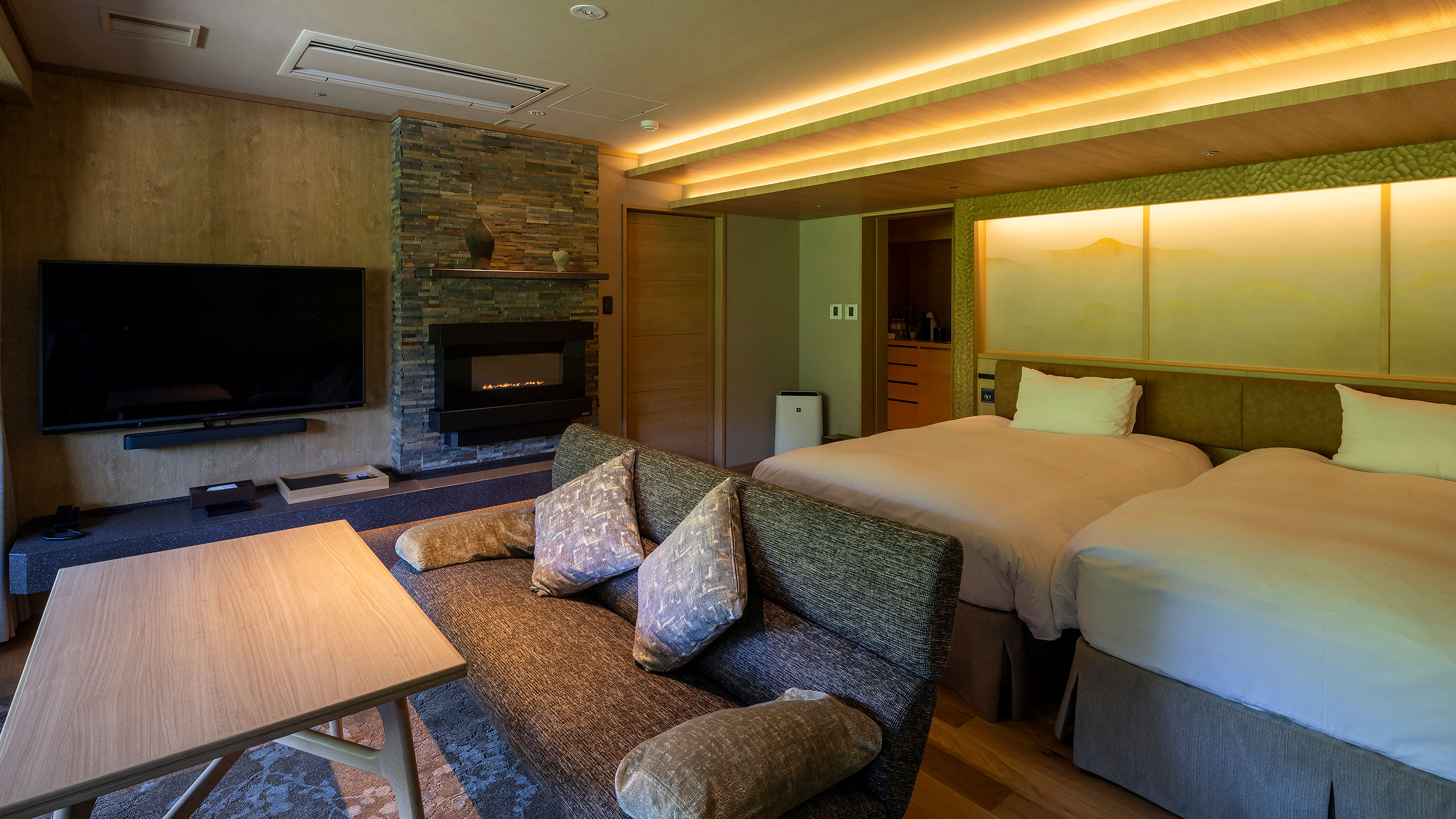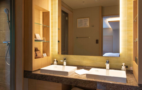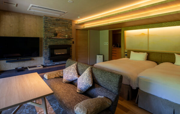 | Facilities | Soaking tub (onsen water) / Separate toilet / Two washbasins / Air conditioner / Flat-screen TV / Safe / Refrigerator / Humidifier and air purifier / Warm water washing toilet seat / LED makeup mirror / Fire place |