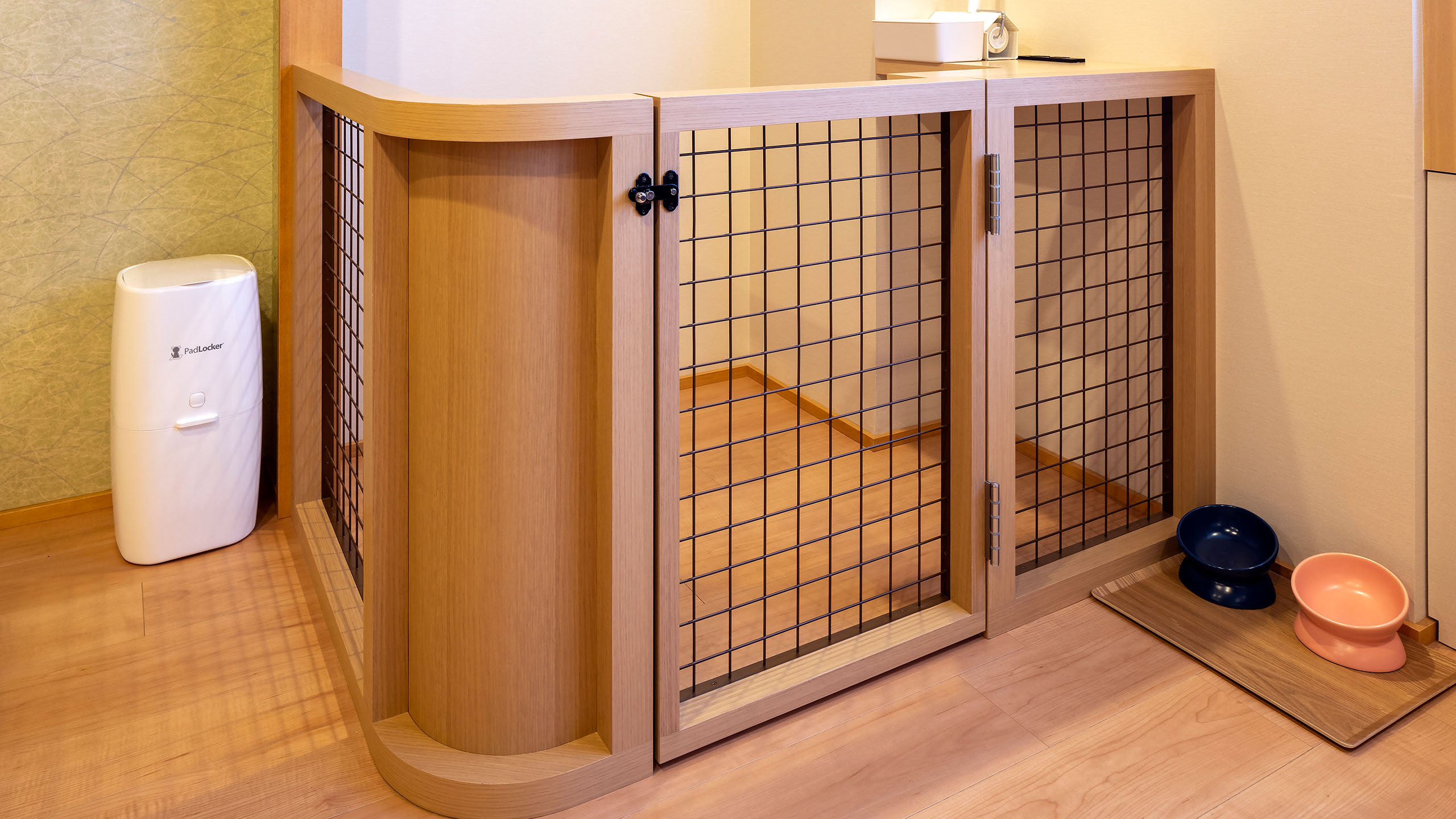 | わんちゃん用アメニティー | オリジナルドギーバック / お散歩ハンディーシャワー / 肉球クリーム / 水 / わんちゃん用給仕カップ / トイレシート3枚 / 消臭ごみ箱 / わんちゃんクッション / ケージ[L100×W93×H75(cm)] |