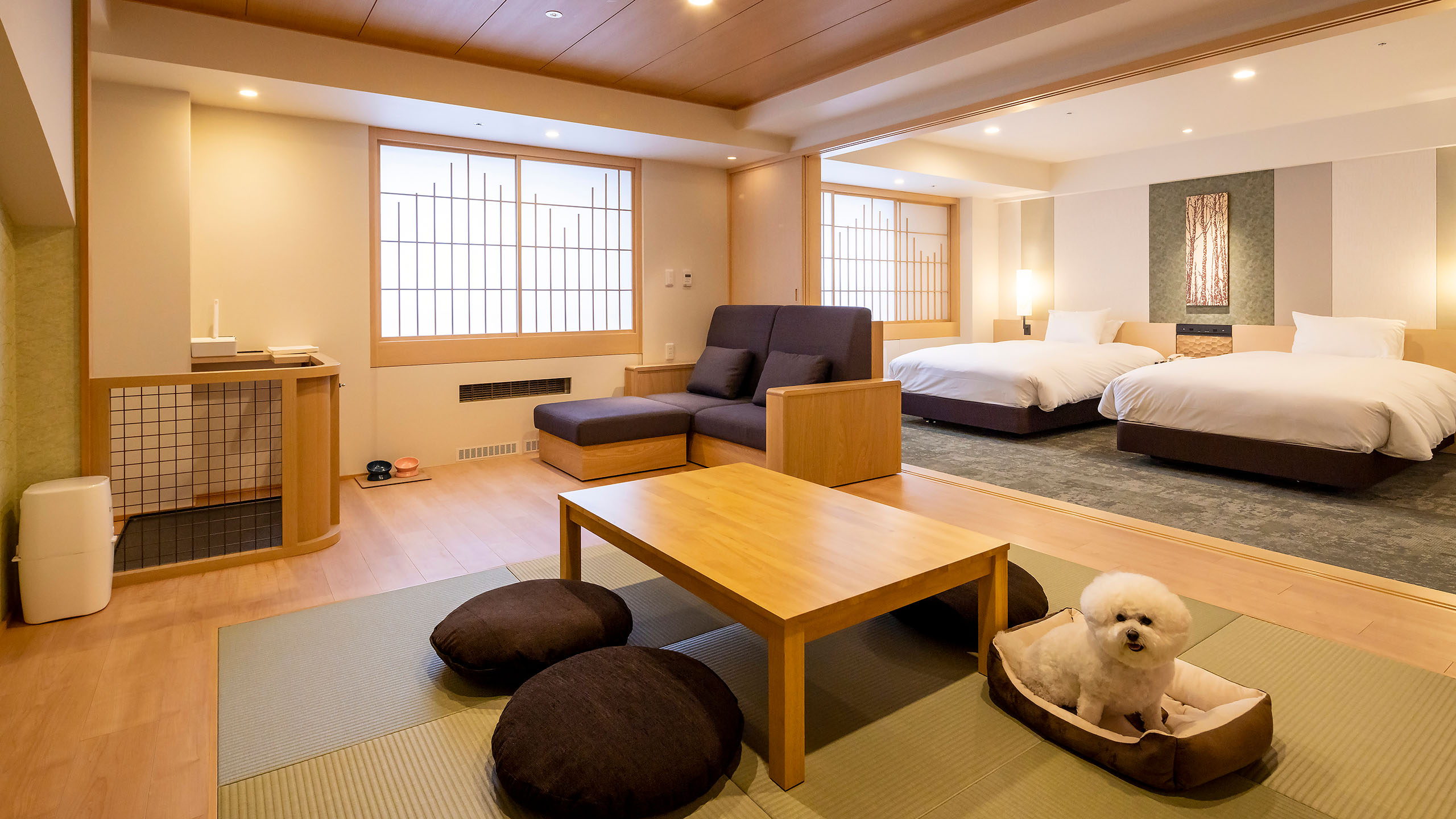 | わんちゃんルームの受け入れ条件 | ・わんちゃんは中型犬以下のサイズで体重15kg前後までとさせていただきます。 ・過去1年以内に狂犬病及び5種混合以上のワクチンを接種したわんちゃんに限ります。 ・全身が納まるケージ又はキャリーをご持参いただき、館内移動時は必ずご使用ください。 ・わんちゃんルーム外への同行はできません。お食事やご入浴の際は、お留守番をお願いいたします。またわんちゃんのユニットバスのご使用はご遠慮ください。 ・無駄吠えが激しいわんちゃんのご宿泊はお断りしております。 ・わんちゃん以外のペットの持ち込み及びご宿泊はお受けしておりません。 ・入館料は1匹につき税込5,500円です。 ※わんちゃんの入館料についてのご案内 2025年1月19日以前にご予約をお済みの場合は、一匹につき3,300円(税込)となります。 |