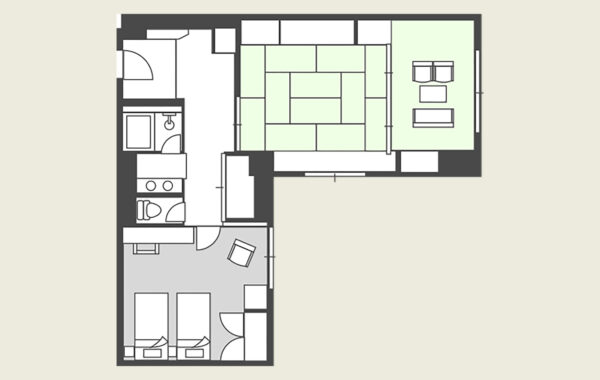 | 備品 | シモンズ社製ベッドマットレス / 敷布団(ブレスエアー) / オリジナル二つ折り枕 / オリジナル羽根掛け布団 / 浴衣 / 陣羽織 / 雪駄 / スリッパ / ヘアドライヤー / 消臭スプレー / 保温ポット / ミネラルウォーター / お茶 / 湯呑 / グラス / 栓抜き / 靴ベラ / ドルチェグスト / マグカップ |